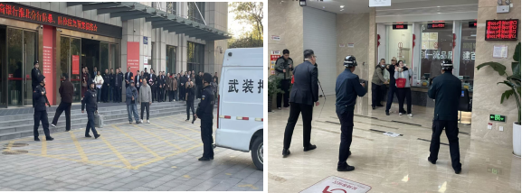 本次演練聚焦實戰化要求,設置兩大高風險場景,場景一:武裝押運車組遭遇“歹徒”暴力搶劫;場景二:營業網點遭遇“歹徒挾持人質”搶劫,全流程模擬突發事件處置。